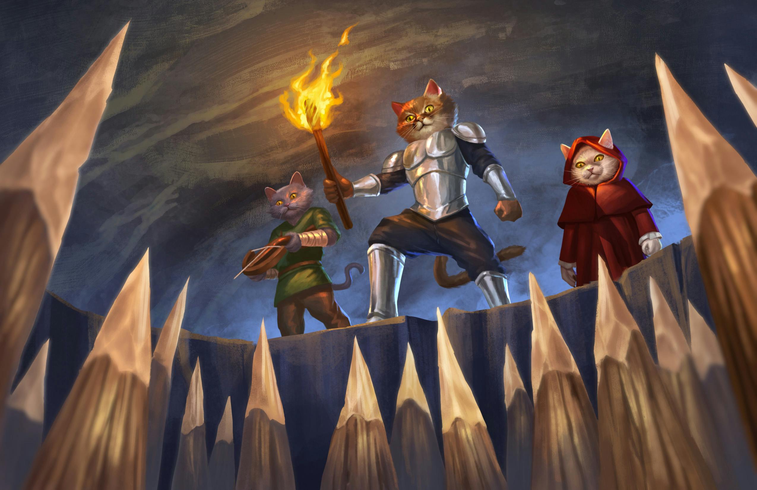 As the bemused mancer stood dumbfounded by her non-sequitur, the wanderer leapt into motion. Her powerful legs shot her over the head of the nearest zombie, who kept staring ahead as if she hadn’t moved. Tucking into a ball, she rolled through the air before landing on her feet before the mage, one paw touching the cold stone to steady her landing.