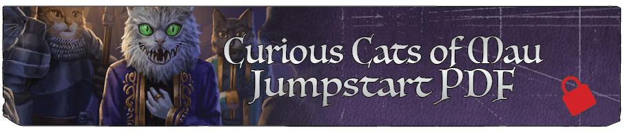 At $35,000 in Funding– JUMPSTART PDF - An introductory scenario designed to introduce new players to the game, along with ready-made characters and a basic rules overview, will be created as a Jumpstart PDF supplement and added as a bonus to the rewards list of all backers receiving the Curious Cats of Mau PDF.
