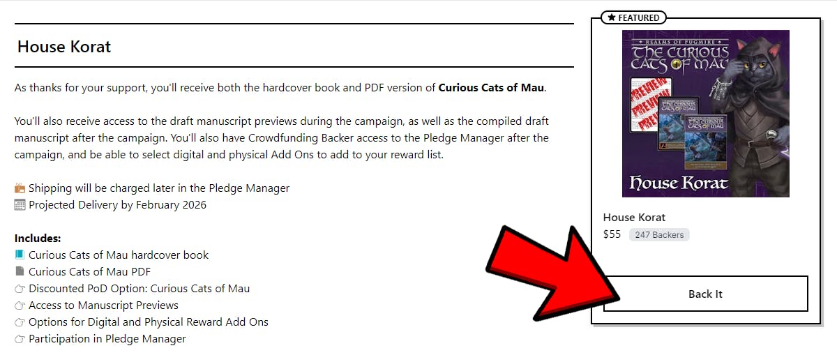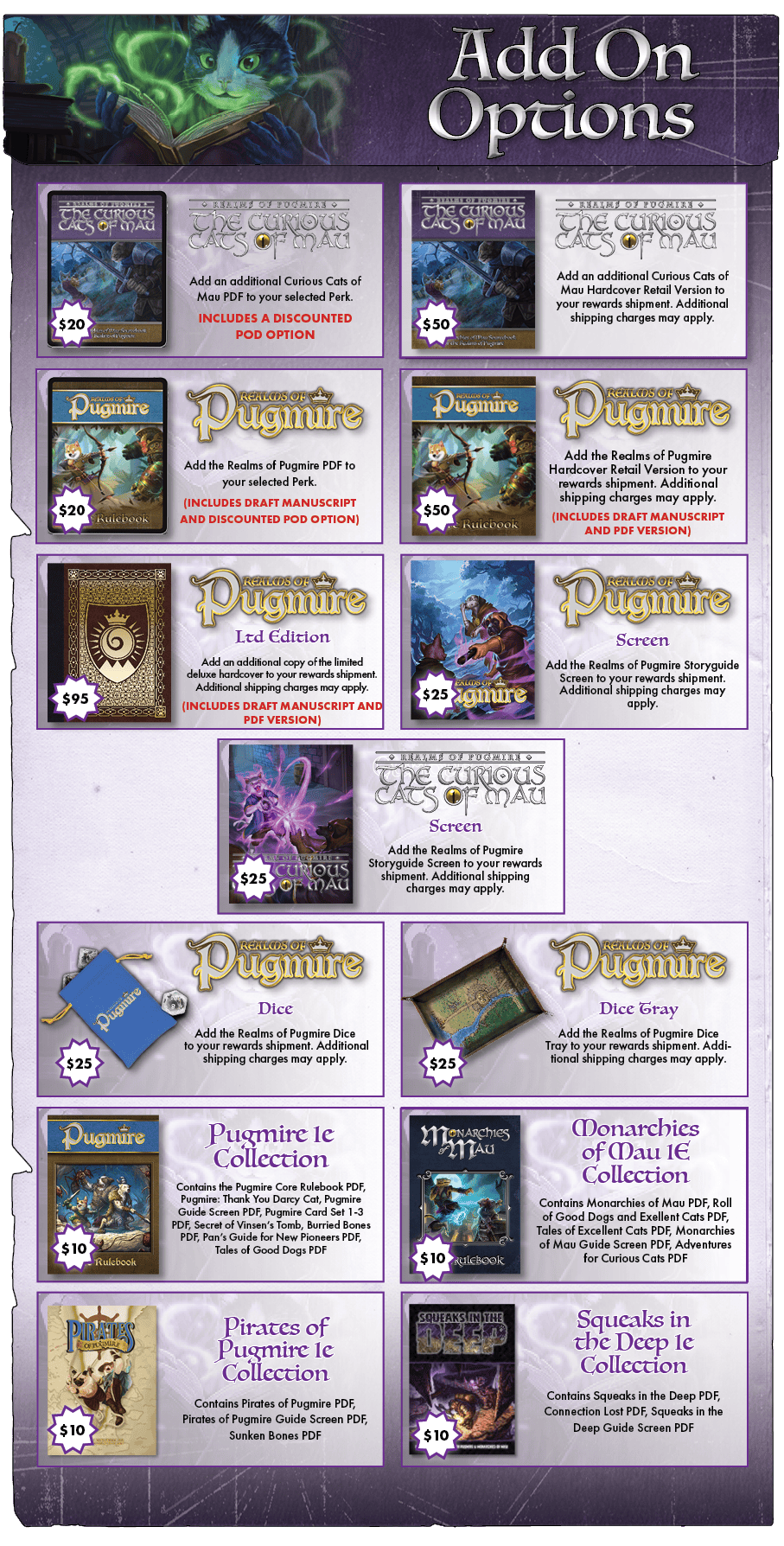 REALMSOF PUGMIRE PDF and HARDCOVER BOOK - The digital version of Realmsof Pugmire will be fulfilled by our partners at DriveThruRPG.com, and the hardcover book will ship alongside your Curious Cats of Mau hardcover reward in a single shipment. Backers pledging to either the House Rex or House Angora tier will have the option to upgrade to the Deluxe Realms of Pugmire book in the Pledge Manager after the campaign.