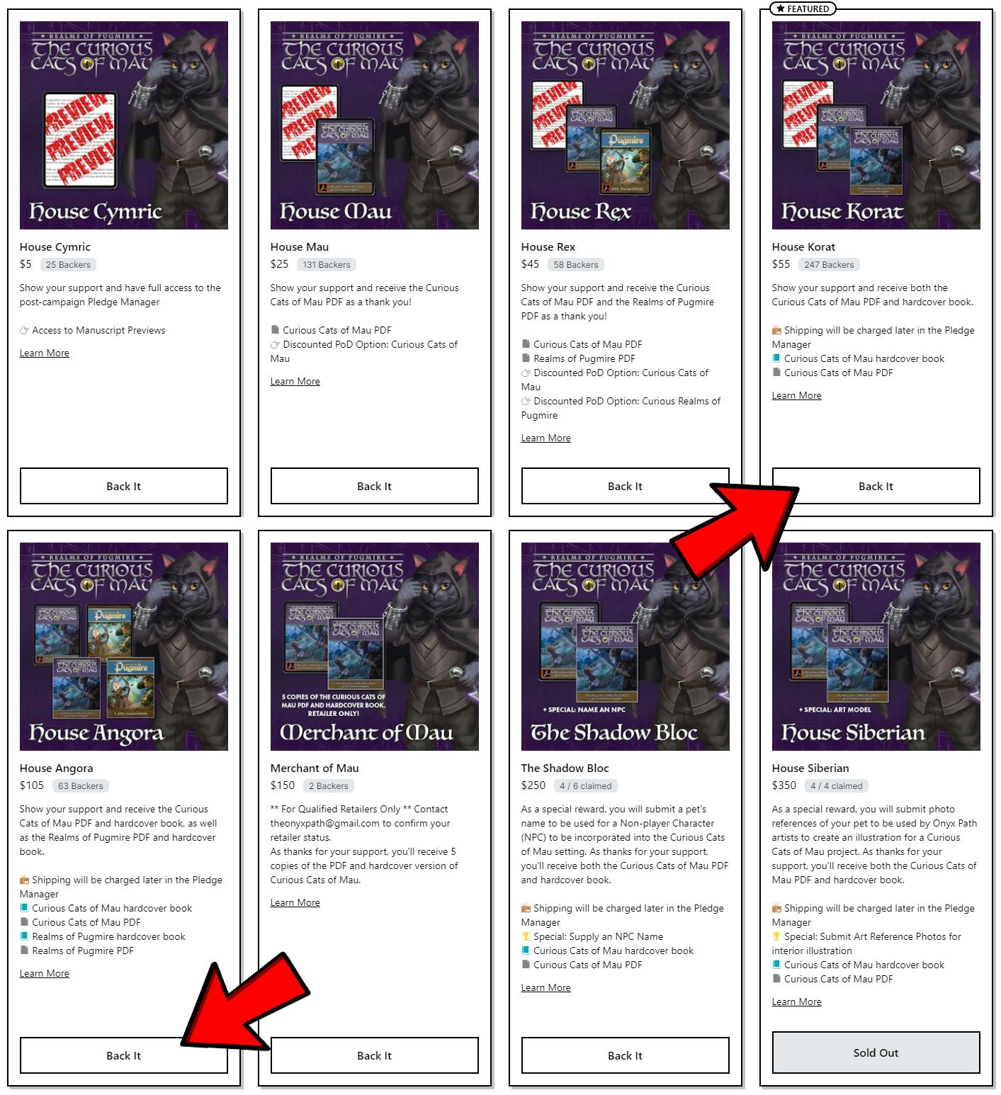 I'm looking at the House Korat pledge. If I hadn't already backed the Realms of Pugmire campaign and secured the hardcover core rulebook, I'd instead pledge to House Angora.