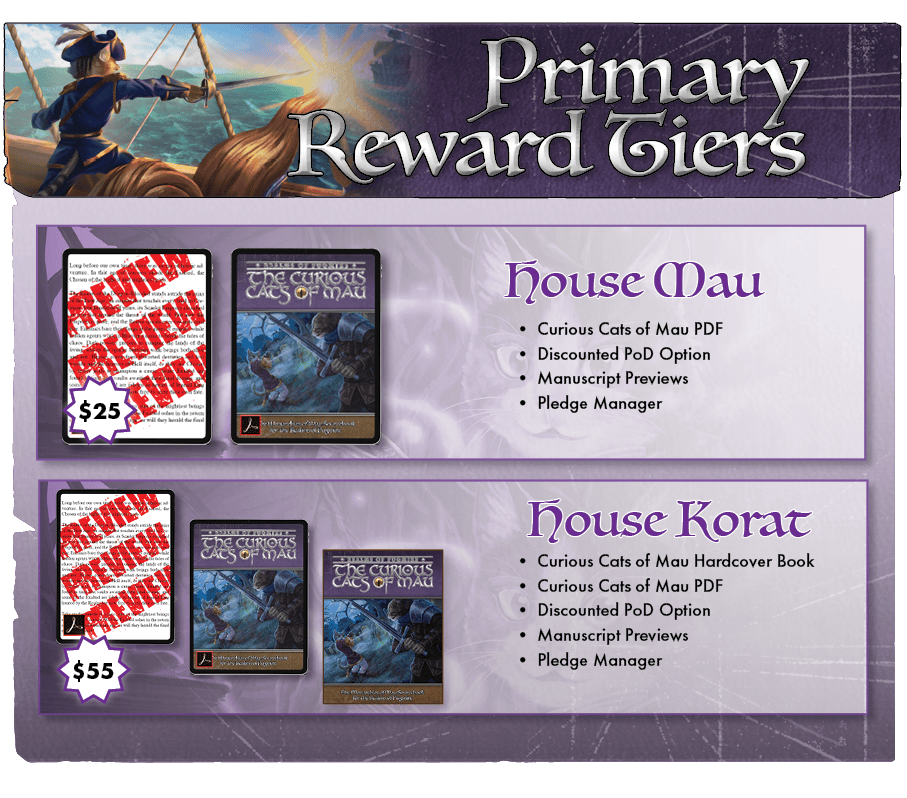 The main reward offered in this campaign is, of course, the main goal of the entire proposition: the finished book for Curious Cats of Mau. The first decision you need to make is what form your rewards will take. Do you want your main rewards in digital form and are going for the PDF rulebook? Or do you have space on your shelf for the hardcover book? (Note - the hardcover version includes the PDF as a bonus!).