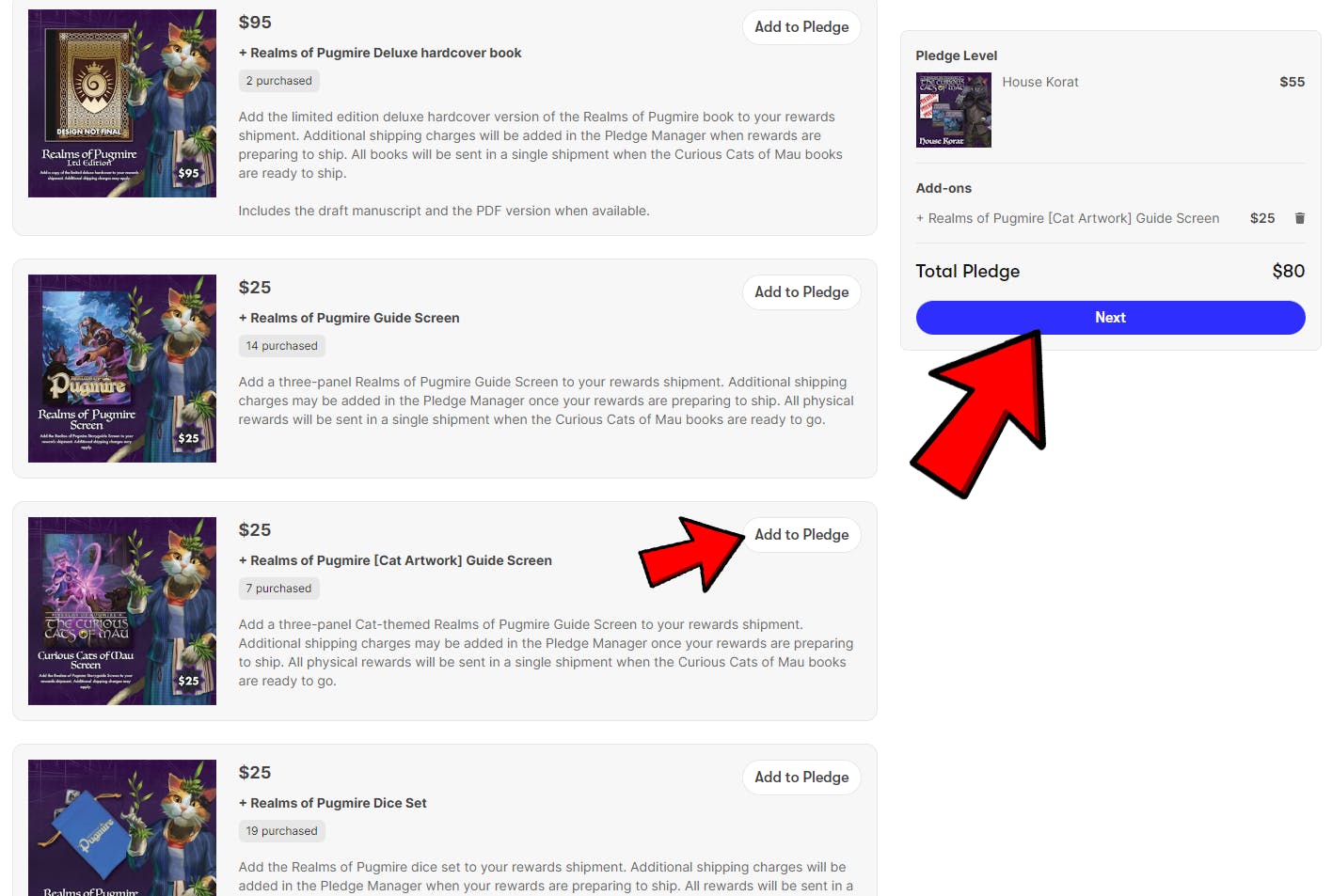 Again, your first step should involve your main reward selection, and your Add On Options will build upon that. If you selected the PDF-only tier, you can investigate PDF and digital options. If you select a hardcover tier, you will be able to add physical reward options. You should not add on additional physical rewards (like the Guide Screen) if the Curious Cats of Mau hardcover book is not included in your pledge tier reward list, but these Add Ons will appear in BackerKit if you later adjust your pledge choice.