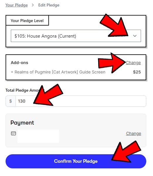 You can select a new Pledge Level from the available option menu, or Change your Add On selection.