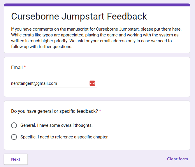Like I said, this project is moving quickly, though, so you may not see your feedback incorporated in the first backer PDF release - it may not happen until the team is going over the backer PDF and prepping for final release. We'll get another round of errata submission when the backer PDF comes out and anything submitted during the campaign will be added to that.