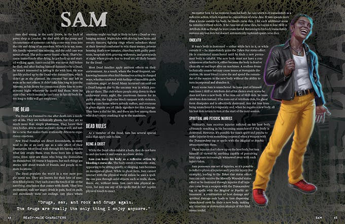 Sam died young, in the early 2000s, in the back of pawn shop in London. He died with all the pomp and circumstance of someone catching a one-way train into the city and dying of an overdose. Which is to say, none. His family reported him missing, and the cold case was never closed. The police never found a body. That’s because immediately after dying, he got back up and started walking again. Sam’s social life was never dull before he died, and after finding himself damned to be a Dead, he wasn’t interested in letting it die with him. He was quickly picked up by the Dead who damned him, which didn’t go as she planned. He resented her and left as soon as he met others. It didn’t take him long to join the Mavens, as his desire for connection drove him to crave extreme highs wherever he could find them. Now he runs a bar, which means he can’t stay in his old body for too long or folks will get suspicious.