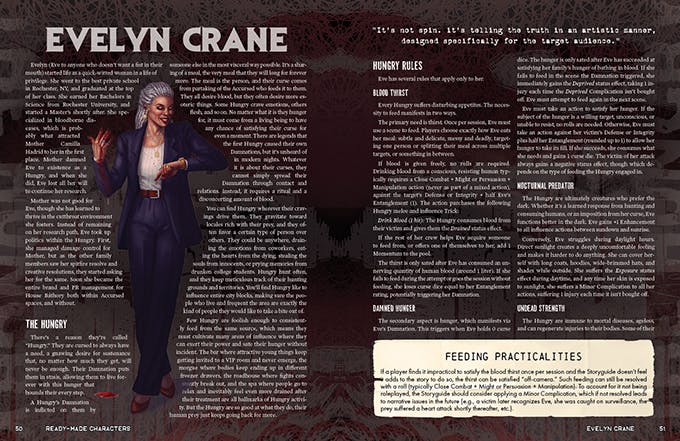 Mother was not good for Eve, though she has learned to thrive in the cutthroat environment she fosters. Instead of remaining on her research path, Eve took up politics within the Hungry. First, she managed damage control for Mother, but as the other family members saw her spitfire resolve and creative resolutions, they started asking her for the same. Soon she became the entire brand and PR management for House Báthory both within Accursed spaces, and without.