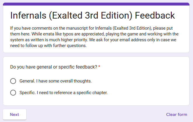 You can use this Feedback Form to share your thoughts directly with the Exalted creative team to help guide them through the next rounds of development and editing.