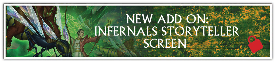 NEW ADD ON: INFERNALS STORYTELLER SCREEN - A three-panel Storyteller Reference Screen with charts and information for running an Infernals game will be created and offered as an Add On to any hardcover reward tiers for +$25.