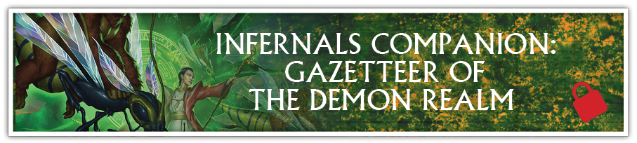 INFERNALS COMPANION SUPPLEMENT: GAZETTEER OF THE DEMON REALMS - An array of new locales in Malfeas, full of adventure, opportunity, and danger will be added to the Infernals Companion supplement. Backers receiving the Infernals PDF will receive the Infernals Companion PDF as a bonus reward. Backers receiving the Infernals Deluxe hardcover will also receive links to purchase a discounted Print-on-Demand version of the Infernals Companion book.