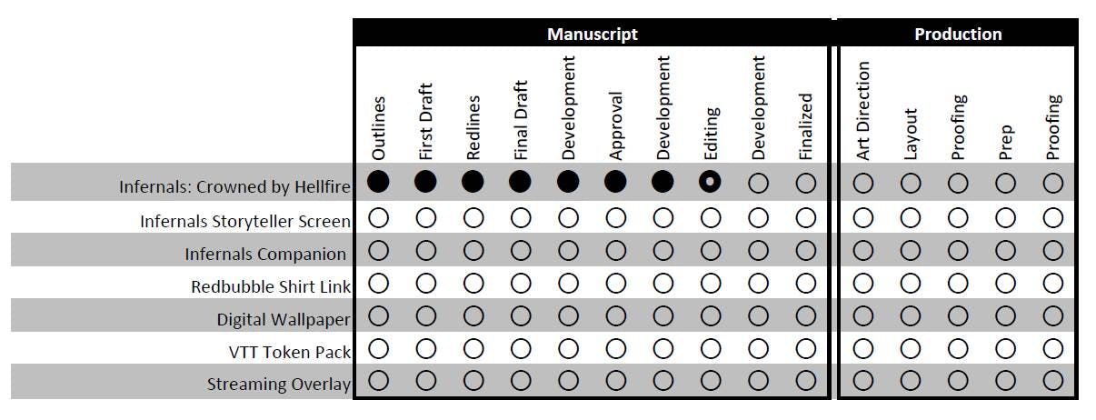 Much like spending XP, we'll fill in dots as the Onyx Path team makes progress on the projects we funded. Right now, our main reward is currently in editing - the draft manuscript is being finalized based on the feedback you provided during the campaign. Then it'll go to one final round of development and the art side of the process can begin. We'll note the progress each month in an updated chart.