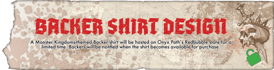 BACKER SHIRT DESIGN - A Monster Kingdoms-themed Backer shirt will be hosted on Onyx Path’s Redbubble store for a limited time. Backers will be notified when the shirt becomes available for purchase.
