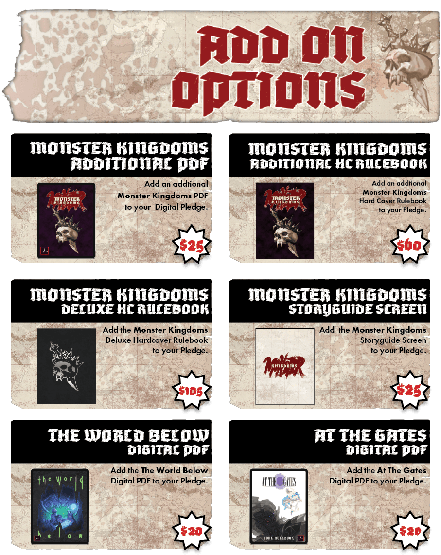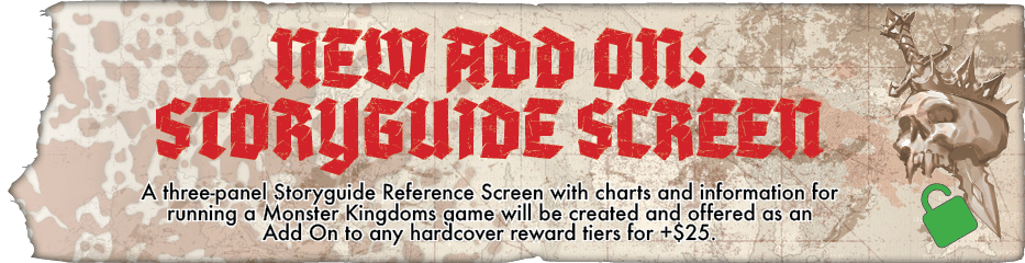 NEW ADD ON: STORYGUIDE SCREEN - A three-panel Storyguide Reference Screen with charts and information for running a Monster Kingdoms game will be created and offered as an Add On to any hardcover reward tiers for +$25.