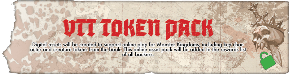 VTT TOKEN PACK - Digital assets will be created to support online play for Monster Kingdoms, including key character and creature tokens from the book. This online asset pack will be added to the rewards list of all backers.