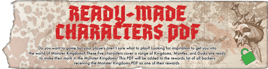READY-MADE CHARACTERS PDF - Do you want to game but your players aren’t sure what to play? Looking for inspiration to get you into the world of Monster Kingdoms? These five characters cover a range of Kingdoms, Mantles, and Dusks are ready to make their mark in the Monster Kingdoms! This PDF will be added to the rewards list of all backers receiving the Monster Kingdoms PDF as one of their rewards.