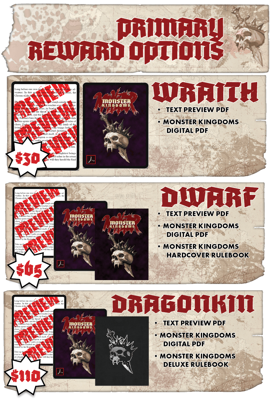 While the world of the Monster Kingdoms is fractured and challenging and full of deadly peril, we've tried to keep supporting this project as simple and straightforward as possible. To pledge support to this project, select one of these pledge path tiers: