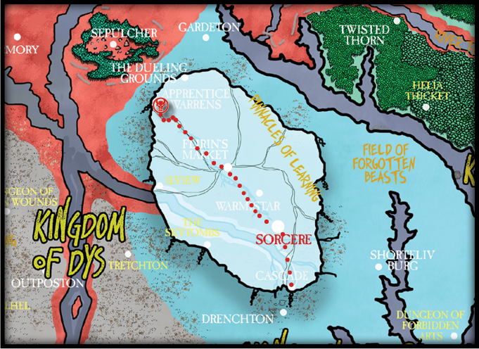 With your chronicler having wasted far too much ink on self-aggrandizing (my accomplishments are nothing compared to those of the archliches, the elder magi, even those imperial scum who name themselves “emperors”), tis time to illuminate you as to my intended journey. Twill be the first time I descend the Haeks, leaving our skybound kingdom of Draoidahaek to place feet firmly on the corrupted earth of Gewinn. Once my descent is assured and I have left our magical utopia behind, floating ever closer to our dual suns Sol and Noc, I will find myself in a gloomier land of greater hardship. This will be the basin above which Sorcere floats and where earthen Draoidahaek spreads. After finding brief respite in Drenchton (at the foot of the great Cascade waterfalls), I intend to enlist a squad of monsters and venture west into the undead kingdom of Dys, avoiding provoking the wailing spirits in favor of learning what I can of their plight.