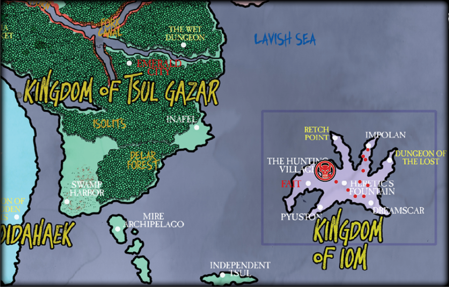 Yet our movements through Tsul Gazar did not keep us there. I had intended on finding the River Thurn and using it to access the Fork Canal, or vice versa, and thus sail northwest from this kingdom toward the Nithera Empire (I have long delayed visiting the imperial domain, as I know from verified accounts how brutally they treat spies), but it was as we were climbing free from the swamp-bound Wet Dungeon that we stumbled into something quite unlikely: a cottage with wide windows, smoke pouring through a chimney, and the smell of freshly baked treats. The three of us, now accustomed to devouring what we could catch, were immediately overcome with voracious appetites and charged into the house to kill whoever was within and eat their sweet, hot food, but entering was a gateway to a realm I hadn’t expected us to visit as yet: Iom.