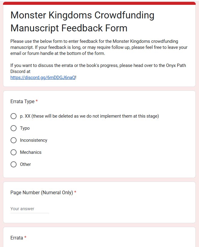 In fact, you can help guide the team through the next stages of development by providing feedback on these manuscript previews! The Onyx Path team has set up a special Feedback Form just for campaign backers for this very purpose: https://forms.gle/TpaaPsUqJ79zD1kE6