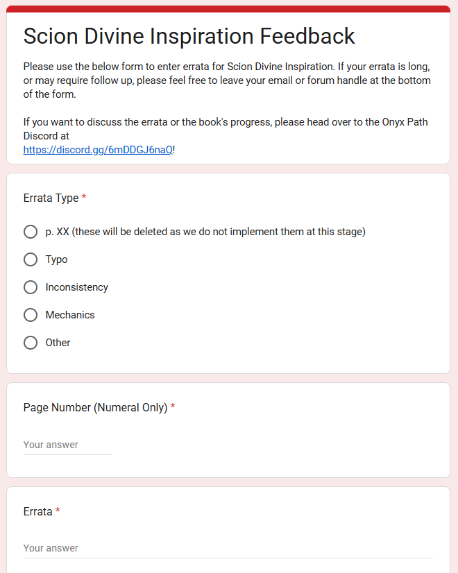 Onyx Path will be launching a special Scion: Divine InspirationFeedback Form!, which you will be able to access here: https://forms.gle/W132P9EUMENVed2S6