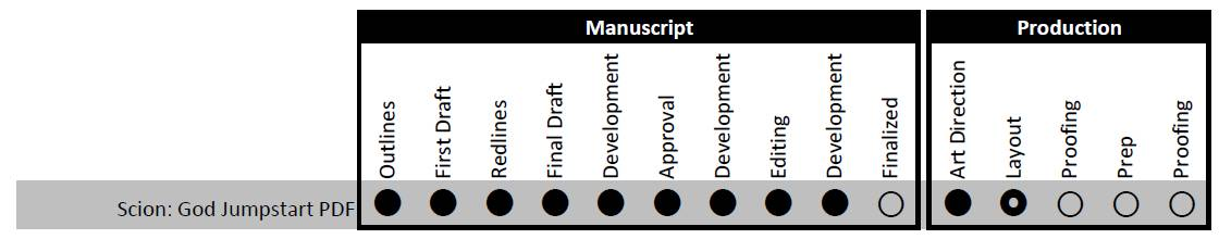 Work continues on our two remaning stretch goal rewards. The Jumpstart is currently in the Layout queue, just waiting for a few other projects to clear out so it can get a bit more attention to finish up. The Divine Inspiration supplement reportedly has all of the artwork completed, so will be sliding over to the layout queue shortly. We're in the home stretch for sure.