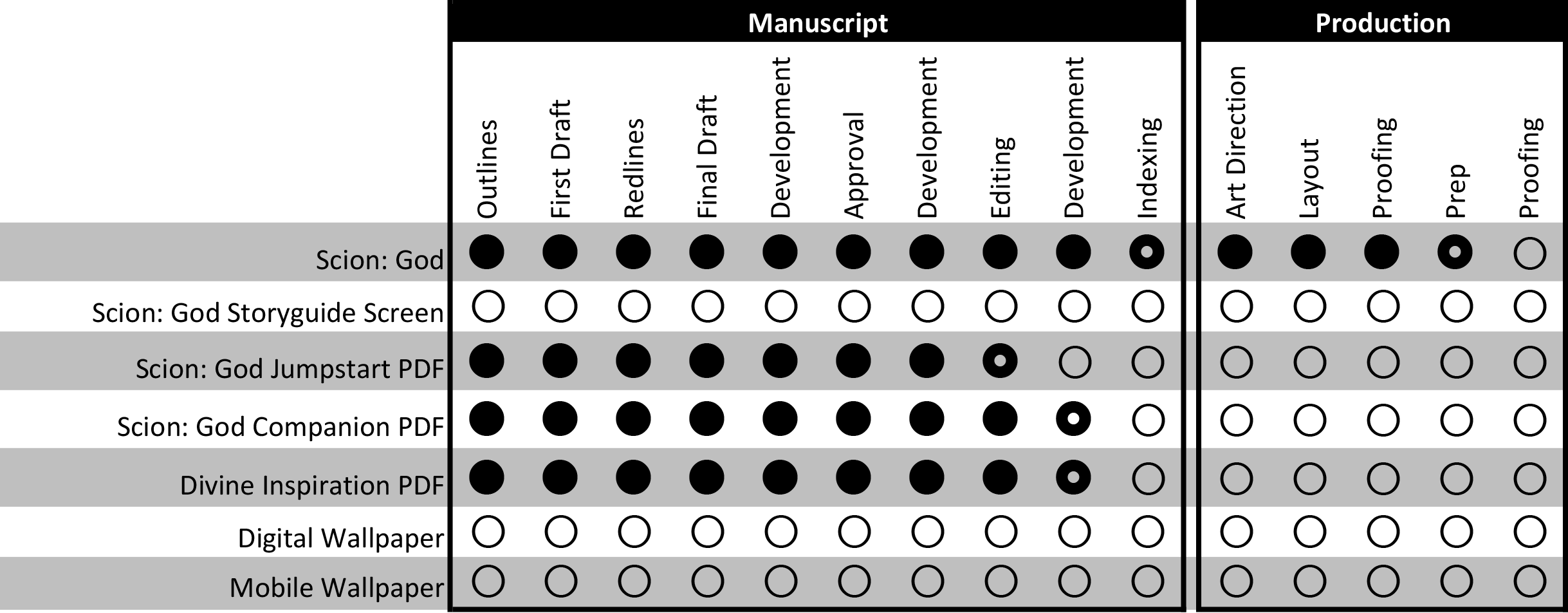 Our Scion: God book is in Indexing and preparing the final PDF release, the Print-on-Demand version of the PDF, and the print run for our hardcover book rewards.