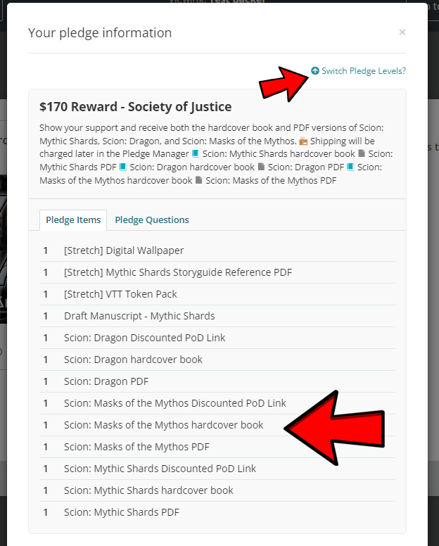 If you click on your Pledge Level, you will see a list of all items included in your Pledge Rewards (including Stretch Goals and the Draft Manuscript), and also have the option to switch your Pledge Level, in case you've decided to get the hardcover pledge instead of the PDF-only pledge tier for example.