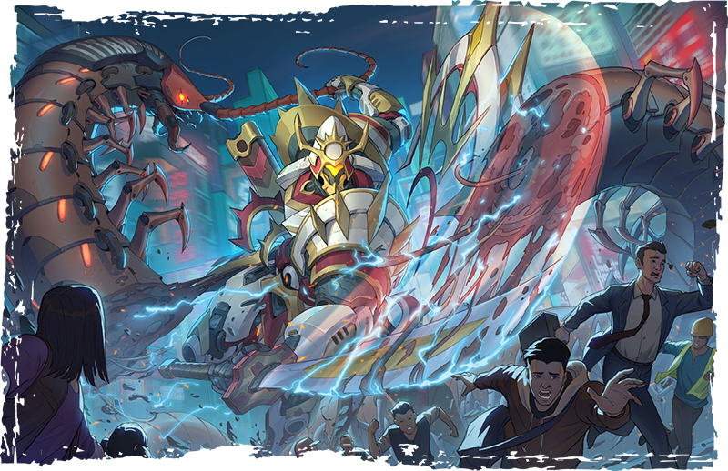 Pilots are always pre-visitation Scions; the spark of divinity lurks within them but can only be expressed through the power of their Hero-Class frames. Using Scent the Divine or similar effects always identifies the pilot as someone with a touch of godhood within them. Likewise, pilot scenes involve human-scale conflict: interpersonal drama, logistics, and the like. Otherwise, all battles take place at colossal scale from the safety of their Divine Machine’s cockpit.