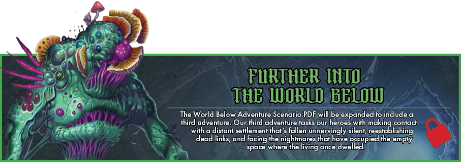 At $58,000 in Funding – FURTHER INTO THE WORLD BELOW – The World Below Adventure Scenario PDF will be expanded to include a third adventure. Our third adventure tasks our heroes with making contact with a distant settlement that's fallen unnervingly silent, reestablishing dead links, and facing the nightmares that have occupied the empty space where the living once dwelled.