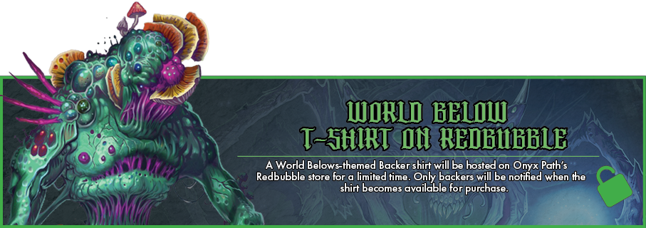 WORLD BELOW T-SHIRT ON REDBUBBLE – A World Below-themed Backer shirt will be hosted on Onyx Path’s Redbubble store for a limited time. Only backers will be notified when the shirt becomes available for purchase.