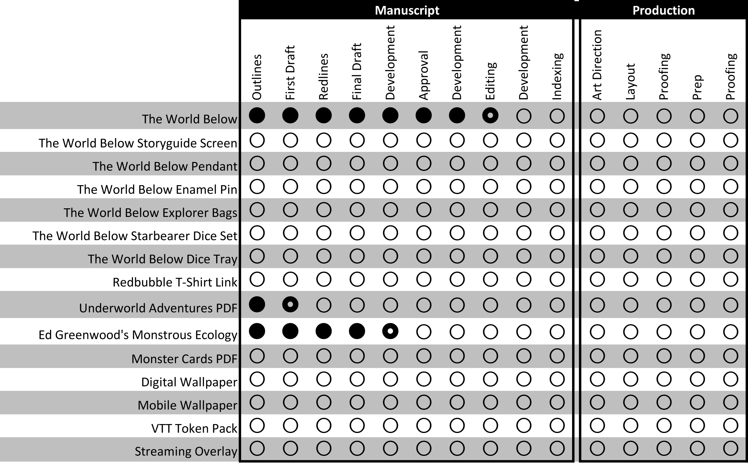 As mentioned last month, each month, I'll list our "Pending" rewards and our "Delivered" rewards. We'll track the project status of our pending rewards by filling in the stage dots, and I'll note which update (and include a link) with each delivered reward, in case you want to go back and re-read the relevant update for more information. If any of these rewards were on your pledge list, you can access download codes in your BackerKit Digital Rewards page. And once they've been added to your DriveThruRPG library, you can access them through your DTRPG digital library at any time.