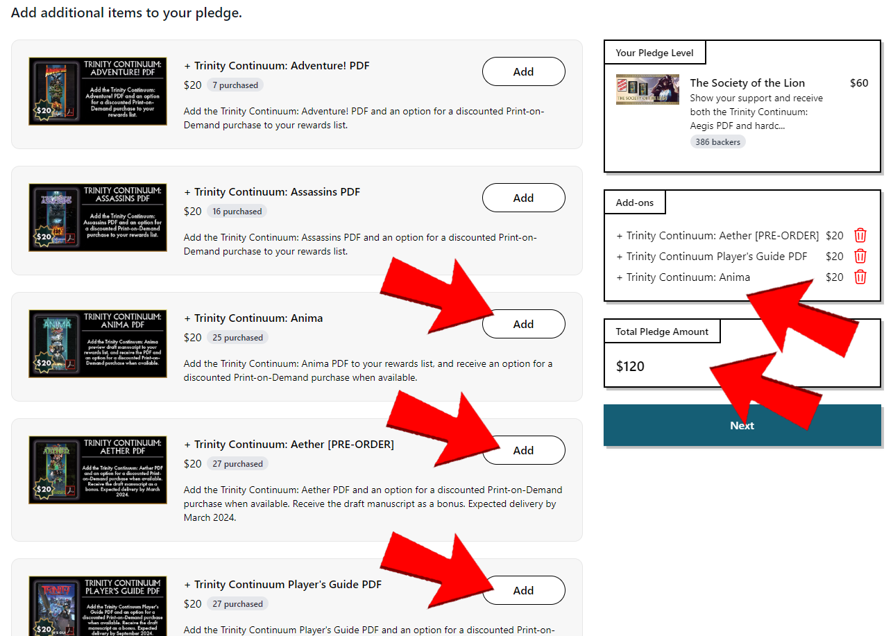For example, I've decided on the $60 Society of the Lion Allegiance, so I select BACK IT for that tier, and then I want to add on some of the more recent Trinity Continuum releases - the Anima, Aether, and the Player's Guide PDFs to my rewards list.