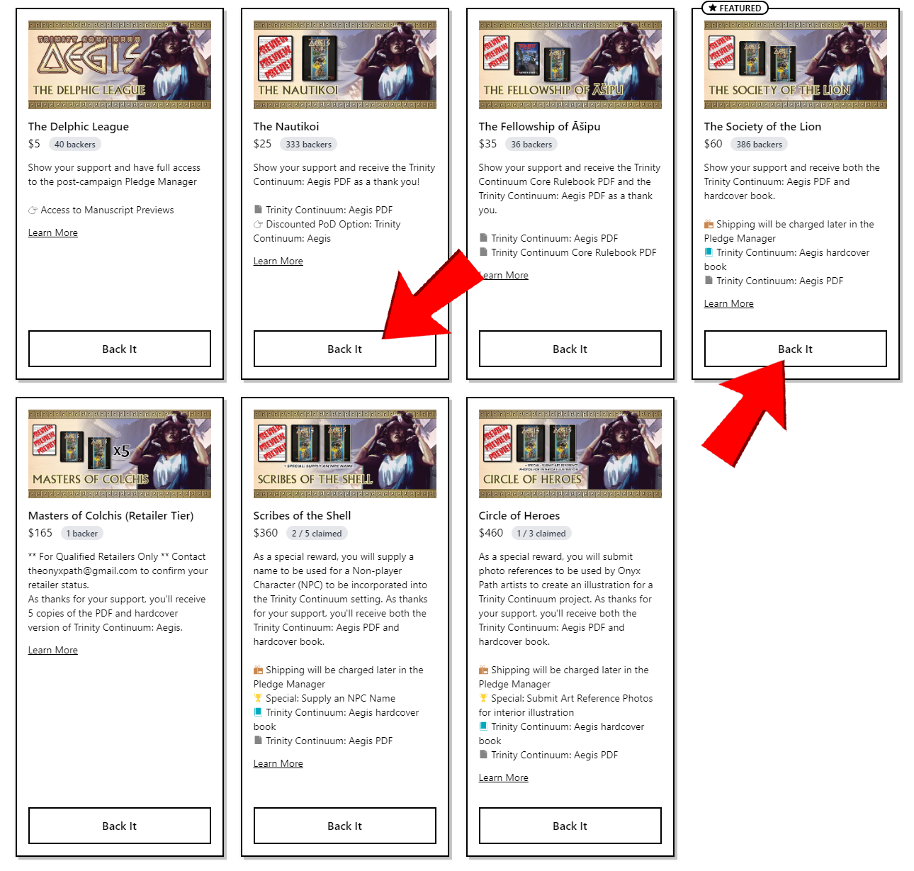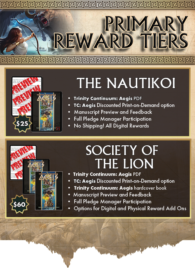 The two main Pledges focusing on Trinity Continuum: Aegis are the $25 Nautikoi for PDF only rewards, and the $60 Society of the Lion Allegiance for the hardcover book.