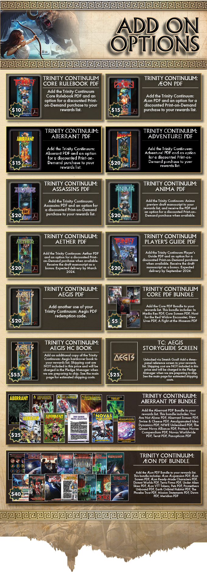 Again, your first step should involve your main reward selection, and your Add On Options will build upon that. If you selected the PDF-only tier, you can investigate PDF and digital options. If you select the hardcover tier, you will be able to add physical reward options. You should not add on additional physical rewards (like the Storyguide Screen) if the Trinity Continuum: Aegis hardcover book is not included in your pledge tier reward list, but these Add Ons will appear in BackerKit if you later adjust your pledge choice.