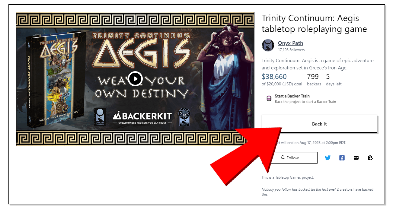 Using myself as an example, I've got many of the previous Trinity Continuum books, and I know for sure that I want the hardcover version of Trinity Continuum: Aegis to sit proudly on my gaming shelf. Once I click BACK IT, I see my pledge level options. If I want to know a bit more about each level, I can click Learn More, or if I know what I'm looking for, I can click Back It.