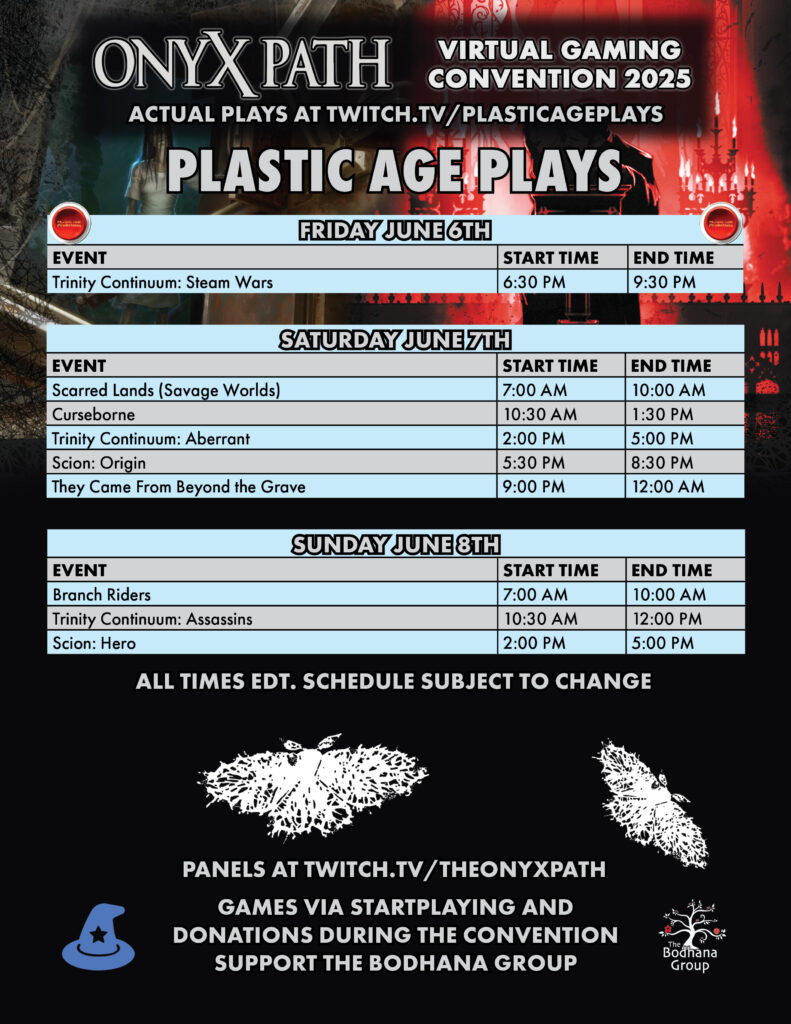 Onyx Path Virtual Gaming Convention 2025 is just around the corner! As they enter the final weeks of preparation, the schedule is settling in. Some panels and actual plays needed minor tweaks, which is normal for this stage of the game. People’s availability shifts and schedule issues bubble up, but so far they’ve been able to roll with the punches pretty easily and are on track for a smooth, fun, and informative show!