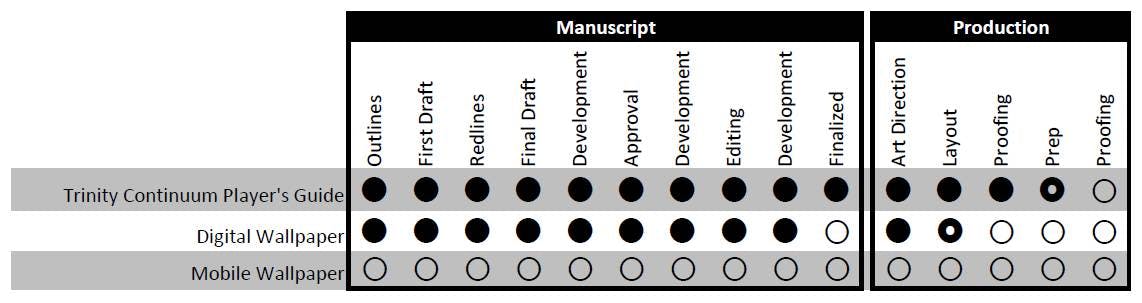 We're still in a print/production holding pattern, circling overhead as the Onyx Path team figures out how to build out their print schedule. They've successfully completed production and fulfillment with their new printing and distribution partners, so there's a process template to apply as they go forward, and a few projects have already joined the queue, but not this one just yet.