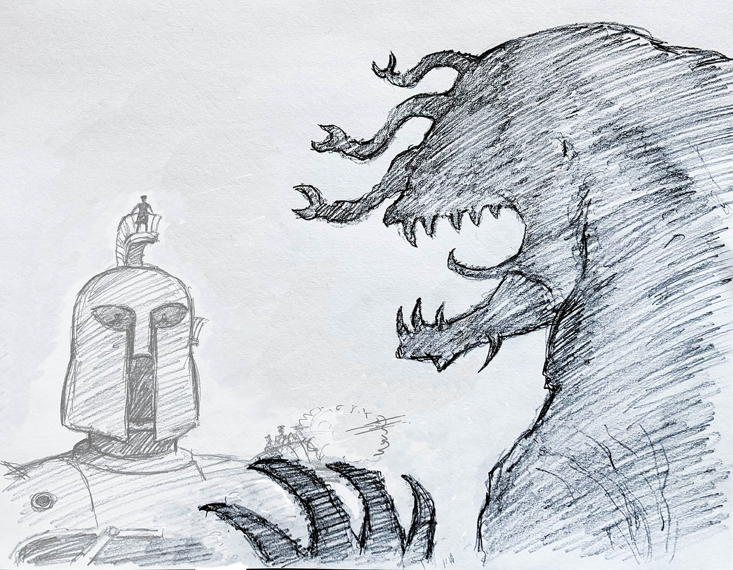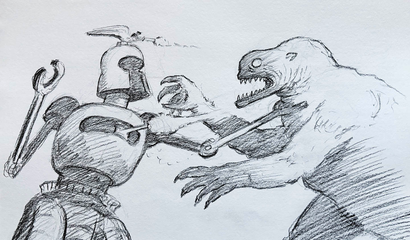 While there's tons of material and many, many game sessions you can run with the stuff included in the Trinity Continuum: Steam Wars book ... what if your Steam Rigs also had the threat of giant kaiju? This potential supplement would introduce a new monstrous threat for our War Rigs and can be used to take the game in entirely new directions. In fact, just the thought of these creatures has begun inspiring intrepid Steam Wars® creator and artist on this project, Larry Blamire, to begin some sketches!