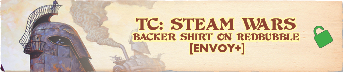 A TC: Steam Wars-themed Backer shirt will be hosted on Onyx Path’s Redbubble store for a limited time. All backers will be notified when the shirt becomes available for purchase. [Envoy reward tier+]