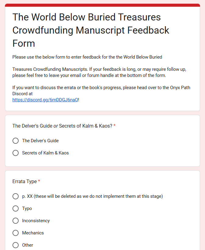 In fact, you can help guide the team through the next stages of development by providing feedback on these manuscript previews! The Onyx Path team has set up a special Feedback Form just for campaign backers for this very purpose: <TWB Buried Treasures Feedback Form>
