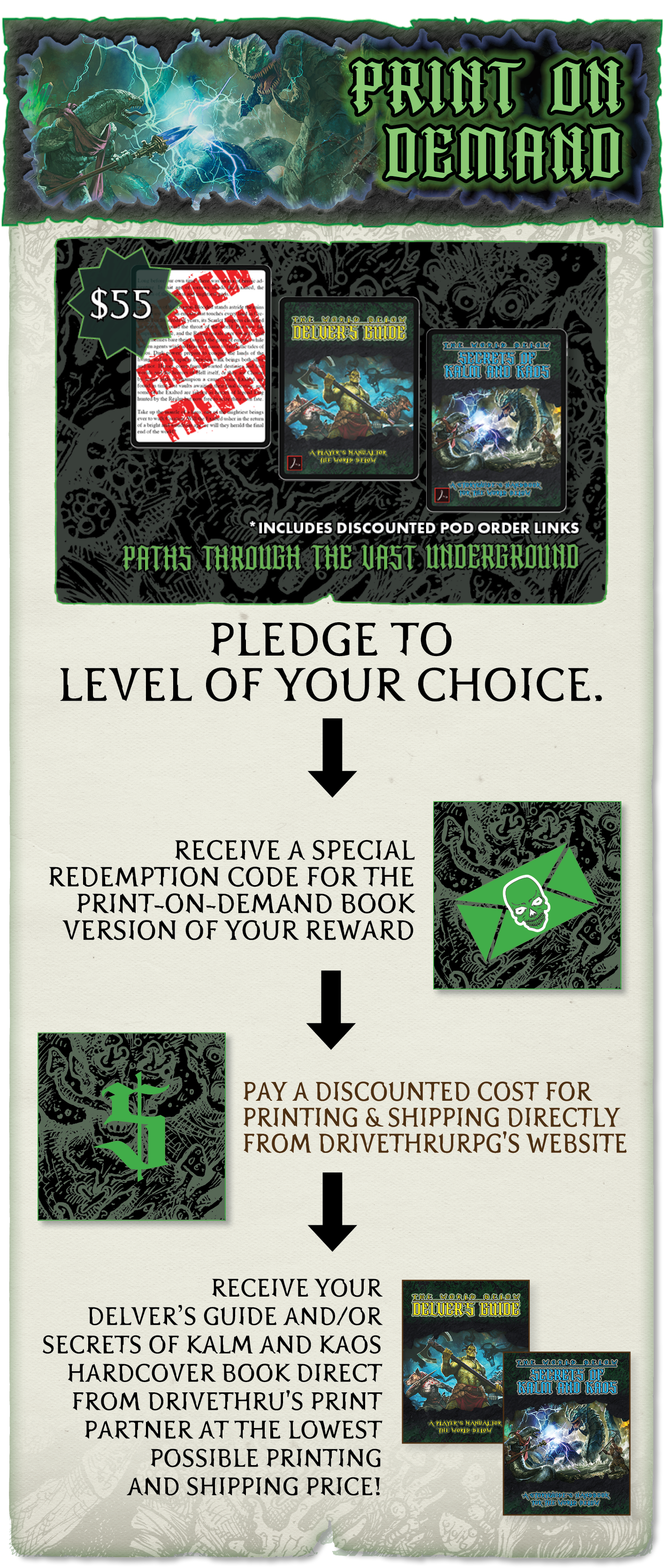 Over the course of the next 4 weeks, backers will receive the entire current draft manuscript for The World Below: Delver's Guide and The World Below: Secrets of Kalm and Kaos, but it's not going to come to you all in one go. The previews will come out in mangeable sections throughout the campaign. This helps me seem interesting over the next 28 days, but it's more about guiding the conversation and helping steer feedback for the developers.
