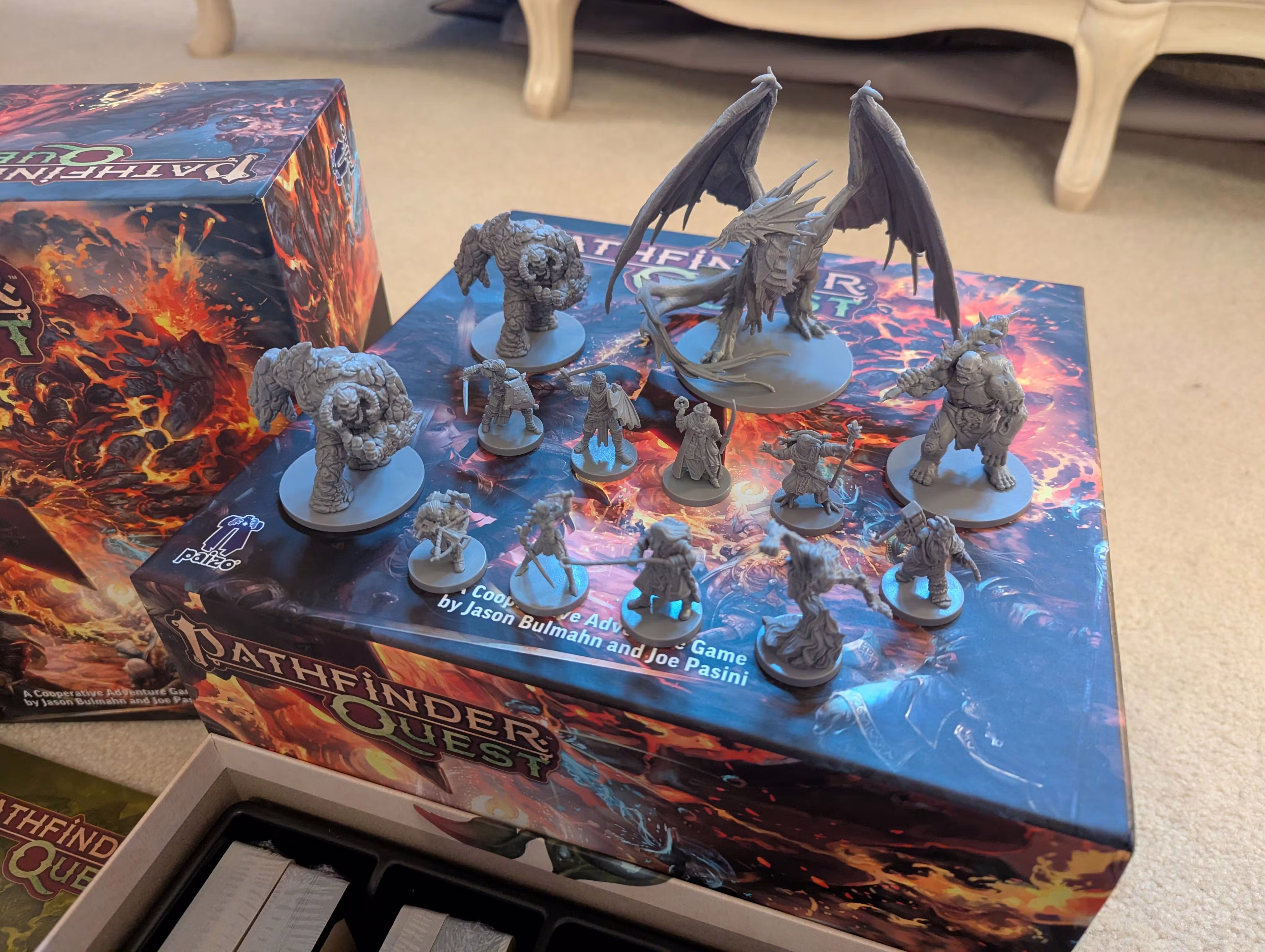 Miniatures on top of the Pathfinder Quest Deluxe Edition box.