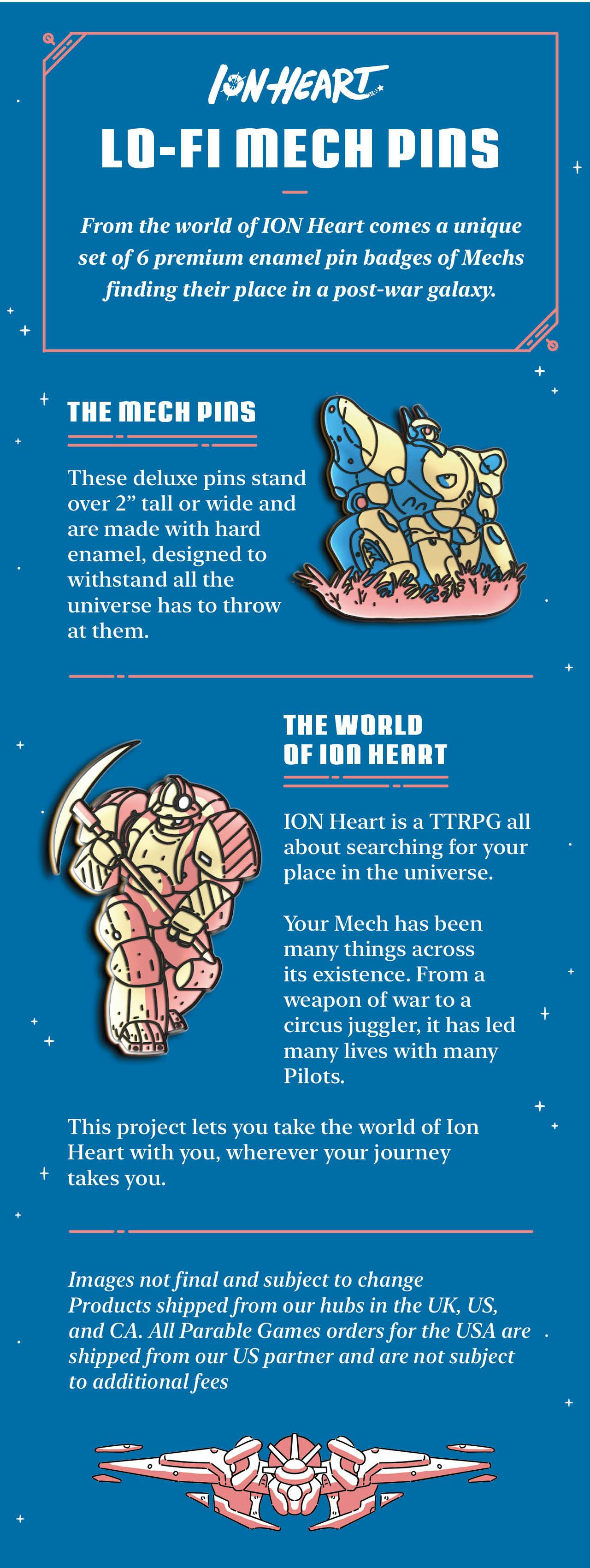 From the Ion Heart come these limited-edition cozy mech pins. Find your place in this post-conflict universe with these premium mech pin-badges. Carry your spark anywhere. Perfect for mech pilots, collectors, and anyone who loves cozy sci-fi vibes.