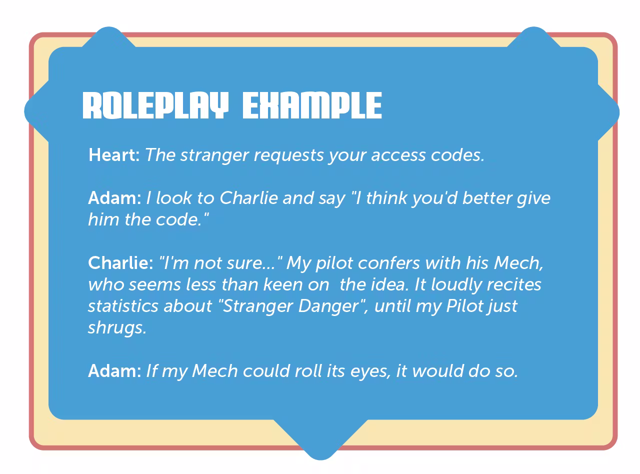 The character of the player's Mech only comes out passively through interactions with their own Pilot, or directly to other players on occasions when the Mech is separated from its Pilot. When a Pilot is interacting with their Mech, no one wants to sit through a one-person roleplay show, so the player would quickly summarise what the interaction is like based on their Pilot and Mech's personalities and bond.