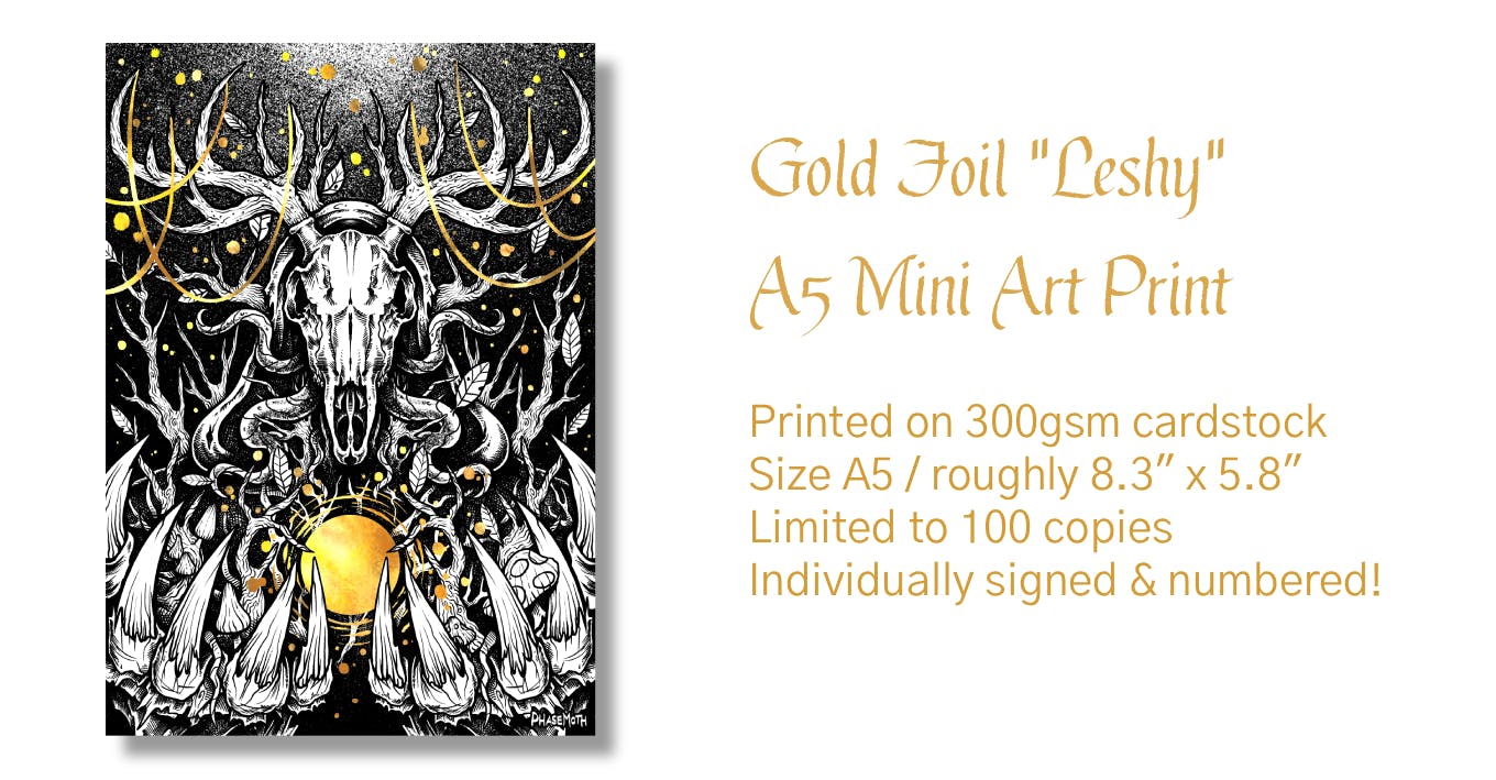 Featuring a brand new original illustration just for this project, this Limited Edition A5 print is entirely monochrome, and includes gold spot foiling! The Leshy ( or Leshen ) is one of my favourite cryptids, as I love it's forest spirit themed origins found in old Slavic folklore. I just had to draw it!
