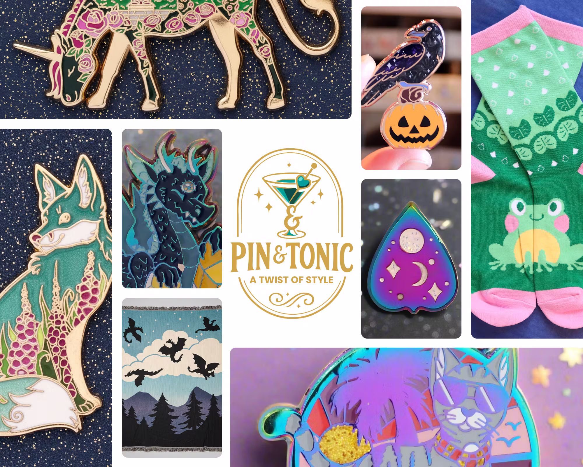Pin & Tonic is a little studio dreamed up, designed, and run by just me here in the UK. Every pin begins as a doodle, then grows into a shiny little treasure through coffee fuelled sketch sessions, colour tinkering, and obsessive fussing over details.