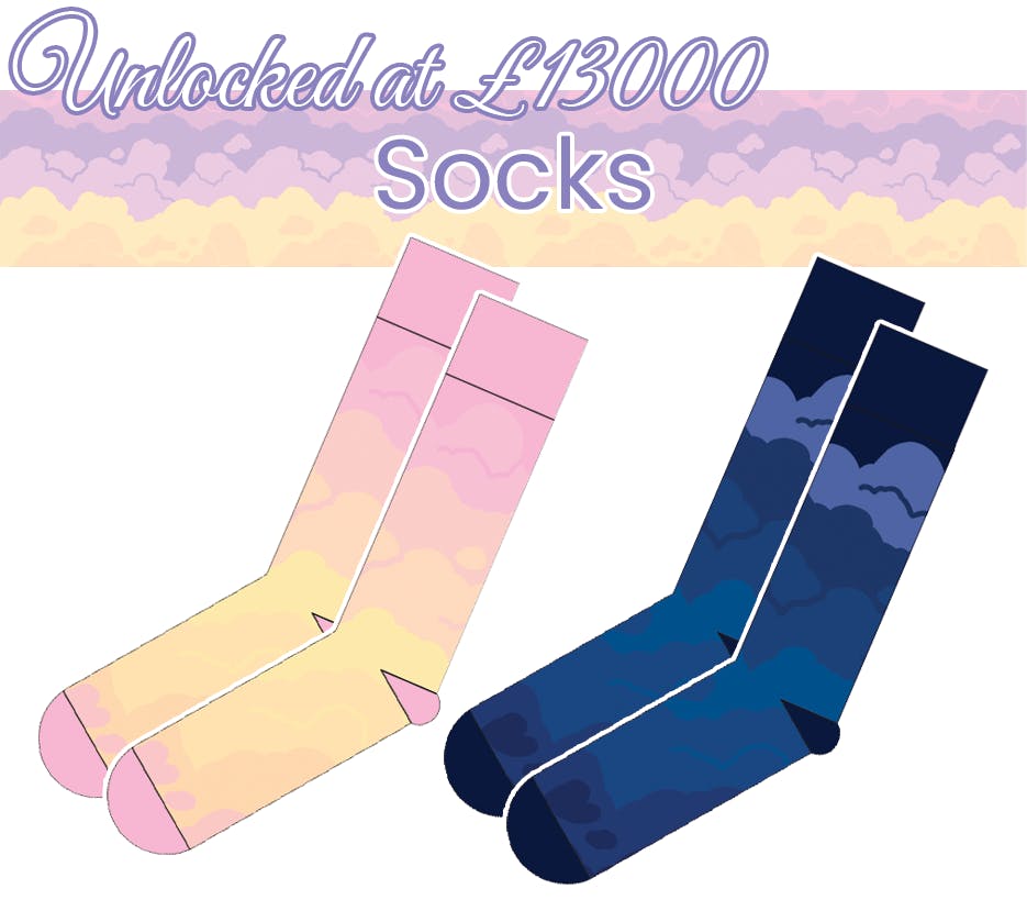 I will create pledge levels and add-ons for the socks and pin banners as we near unlocking them. We still have 13 days to go, so let's make them epic!! 😍😍😍