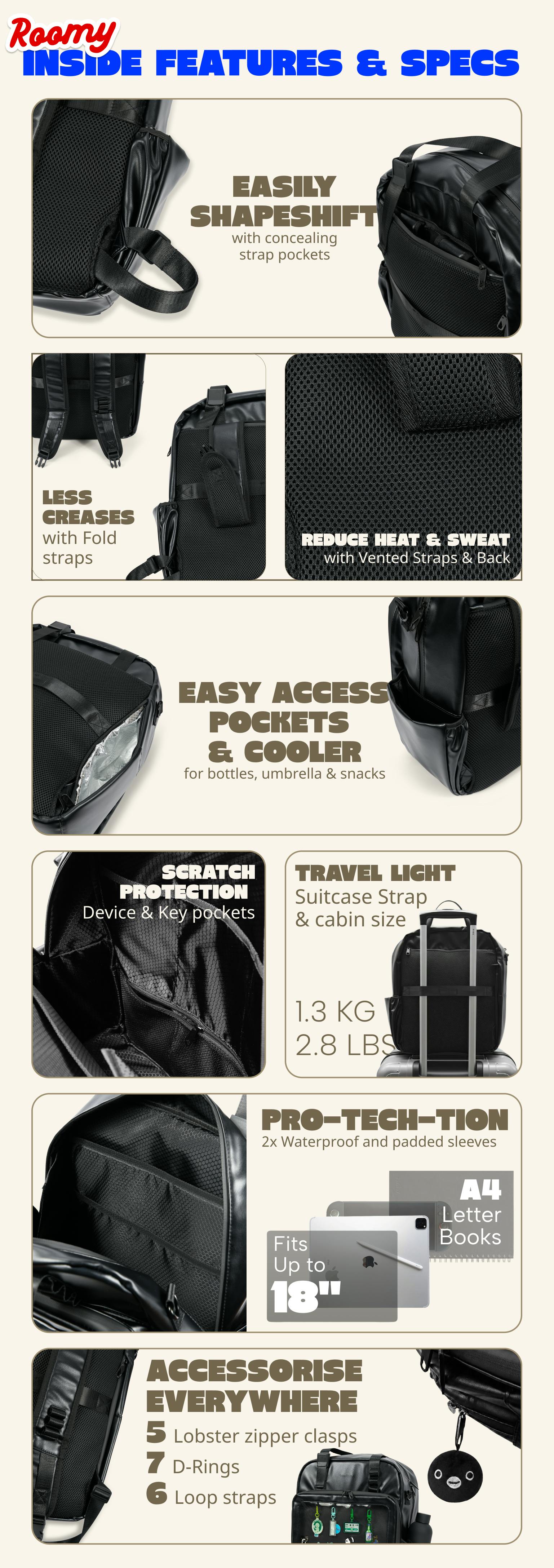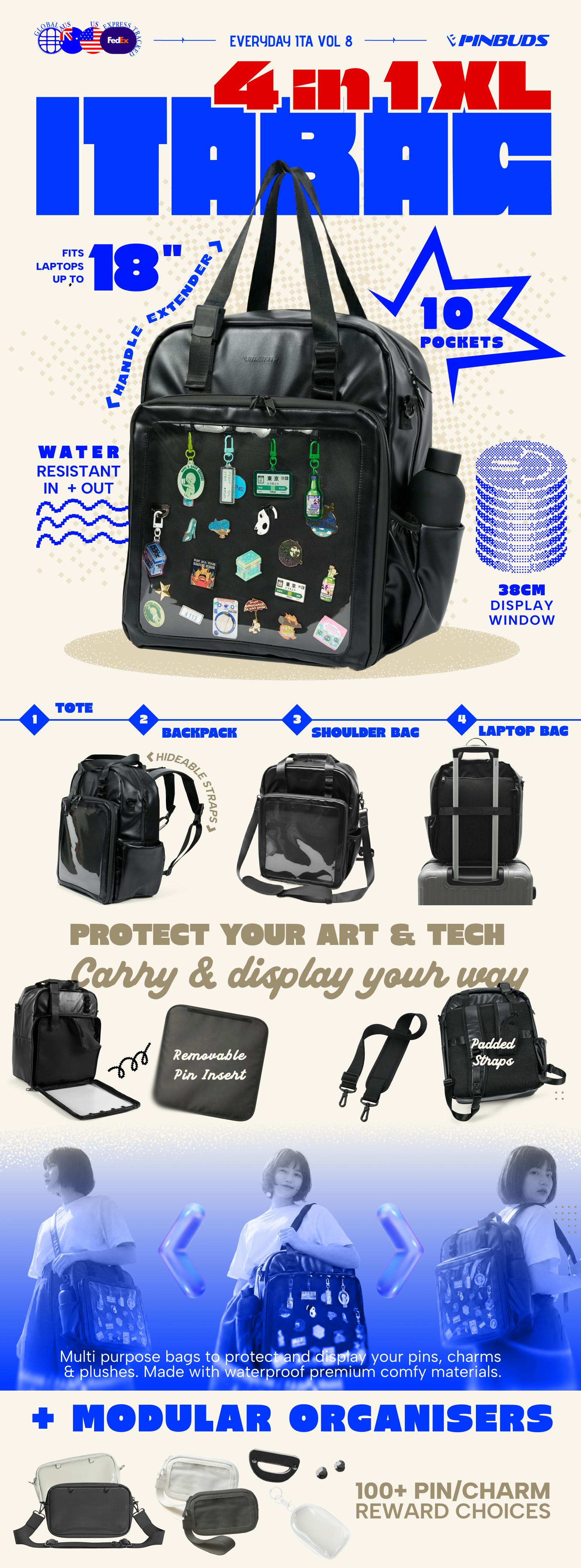 We are launching the most versatile & comfortable ITA Bag ever. This has been co-created with feedback we've been hearing from our convention fans. Get 4 bags in 1 with our latest ITA Bag XL, which can hold devices of up to 18" and has a pin insert of 38 cm / [incjhes]. This bag is built with outdoor grade materials like triple reinforced nylon backpack straps, waterproof exterior and interior so that it can last years to come.