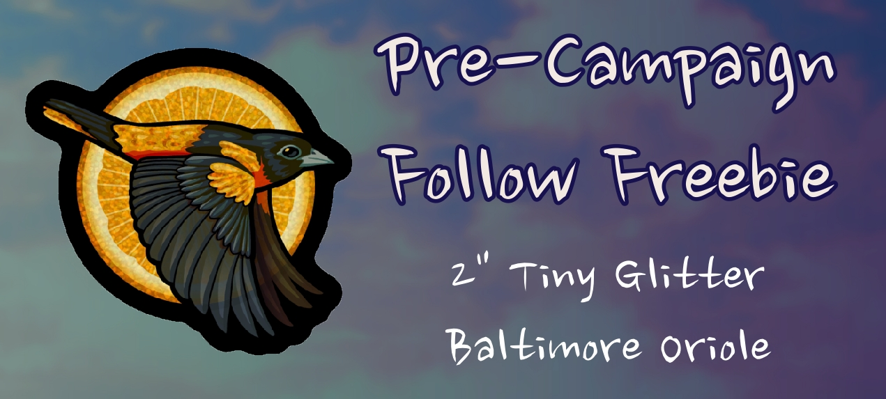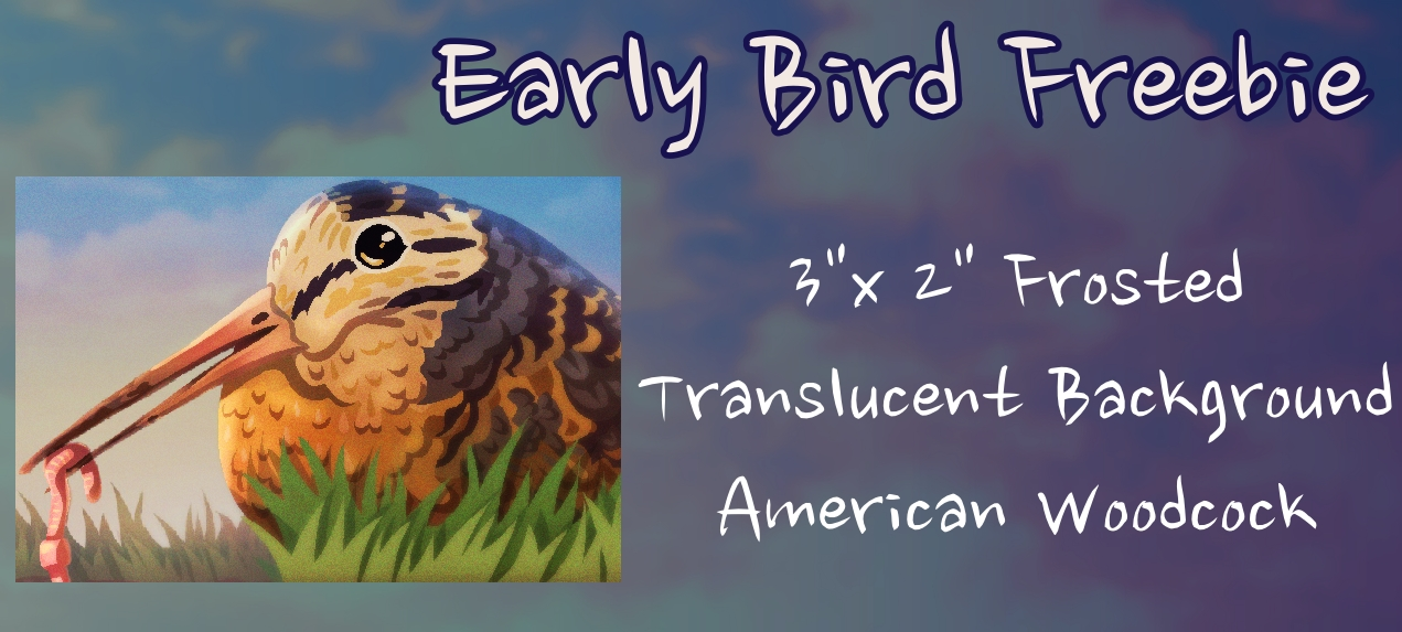 Pre-Launch Follower The Baltimore Oriole not only eats oranges- it looks like them too! You can get this 2" sticker free by following the project before launch. If you're recieving this update, you've very likely already earned it! Early Bird They say the Early Bird gets the worm- so does the Woodcock! Get this 3" sticker free by backing within the first 48 hours of the campaign.