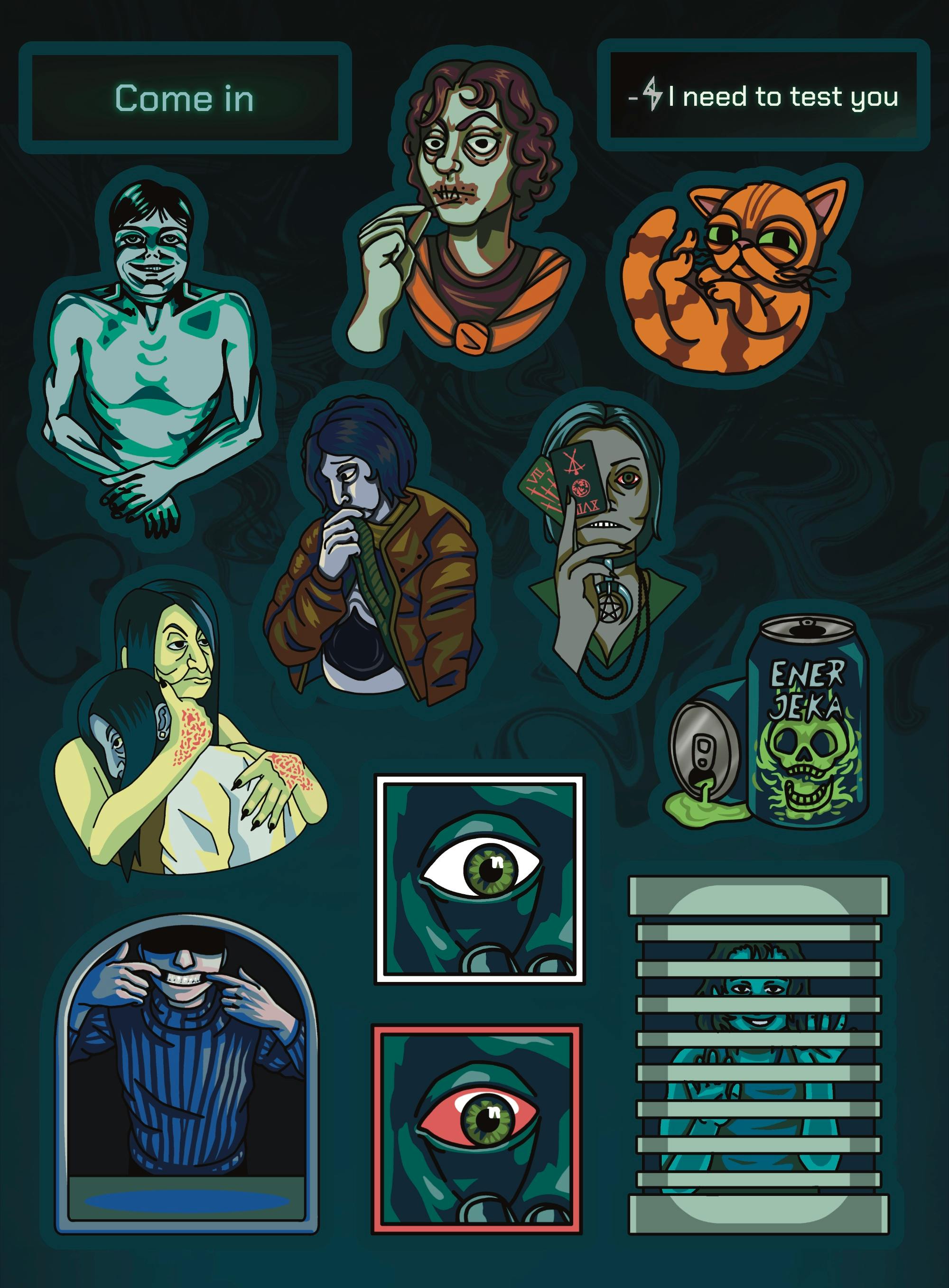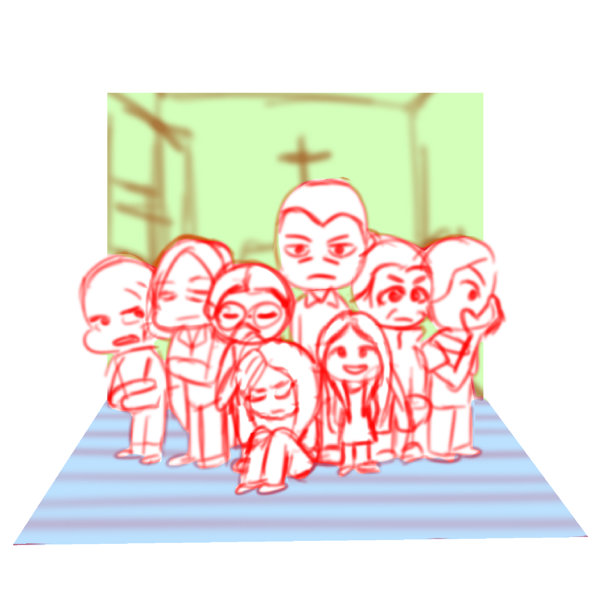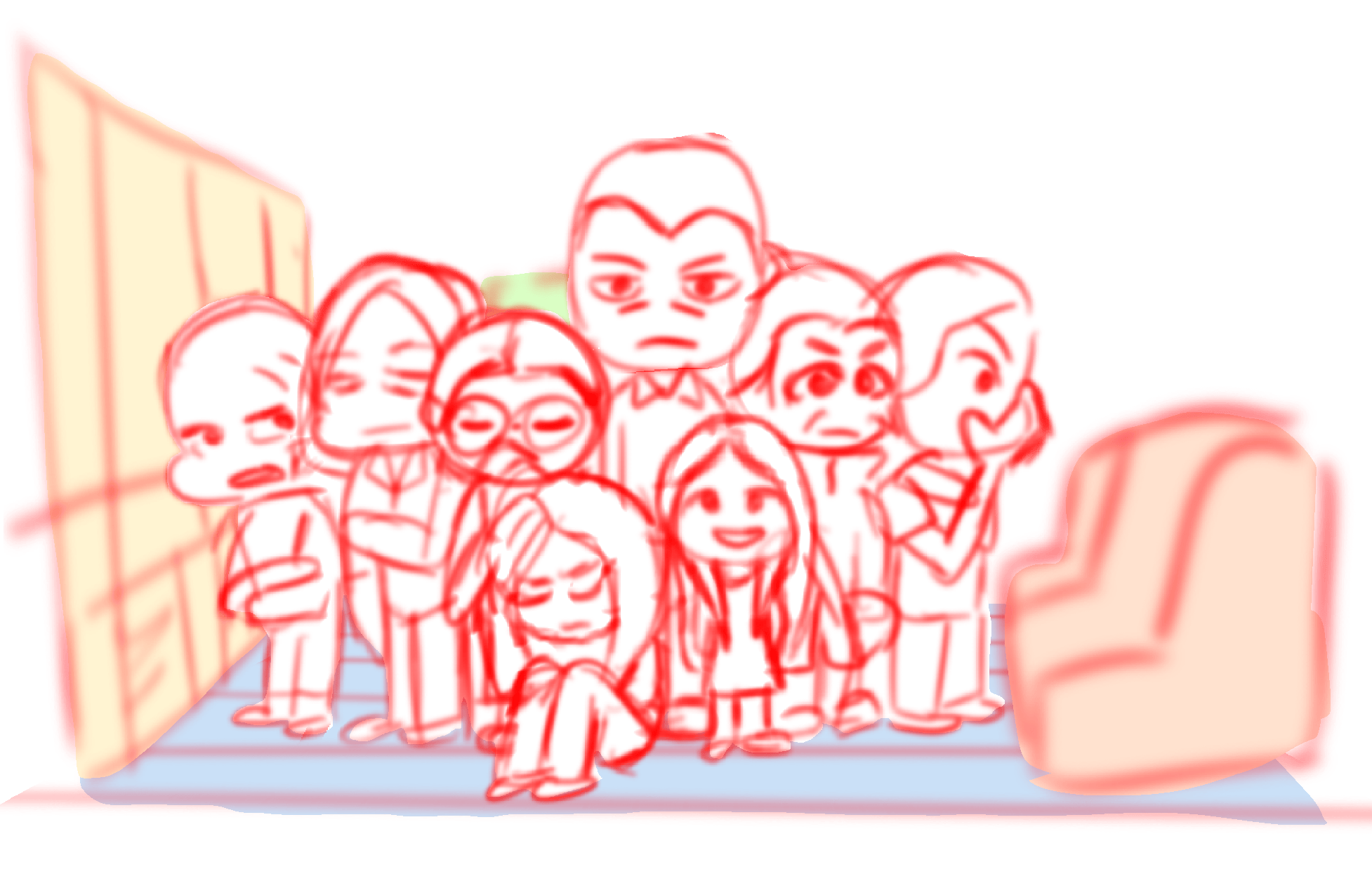 Now for two updates on whats in-progress! First up is the Sticker Sheet! Please note it is not complete. I left an empty space for a small additional sticker to be exclusive to it. There are also some extra spaces for teeny stickers! The two text-boxes I recreated for the project's description GIFs along with the Sisters pin that was removed are additionally added in. What would you like to see in this empty space? Comment below and let the most popular comment win! Next up, I have created three options for how we can about the Human Standee: Option 1. Full room This mock-up displays a full three surrounding walls. It is the most fancy, but also most expensive. This option spreads focus across both the Humans and their surroundings.