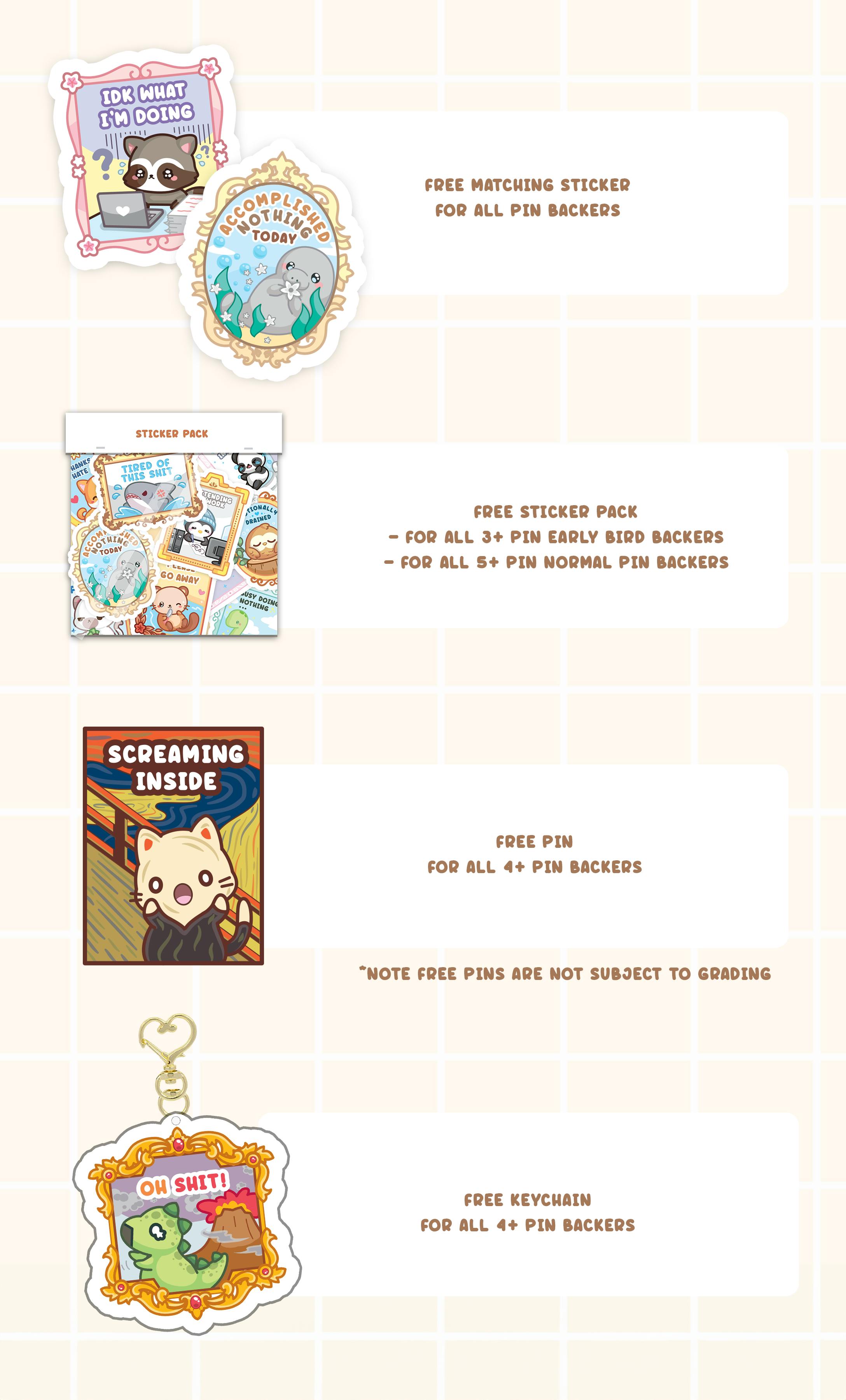 Early Bird 3+ Pin Backers will receive a free FULL sticker pack (US$65 Value!) Regular 5+ Pin Backers will receive a free FULL sticker pack (US$65 Value!)